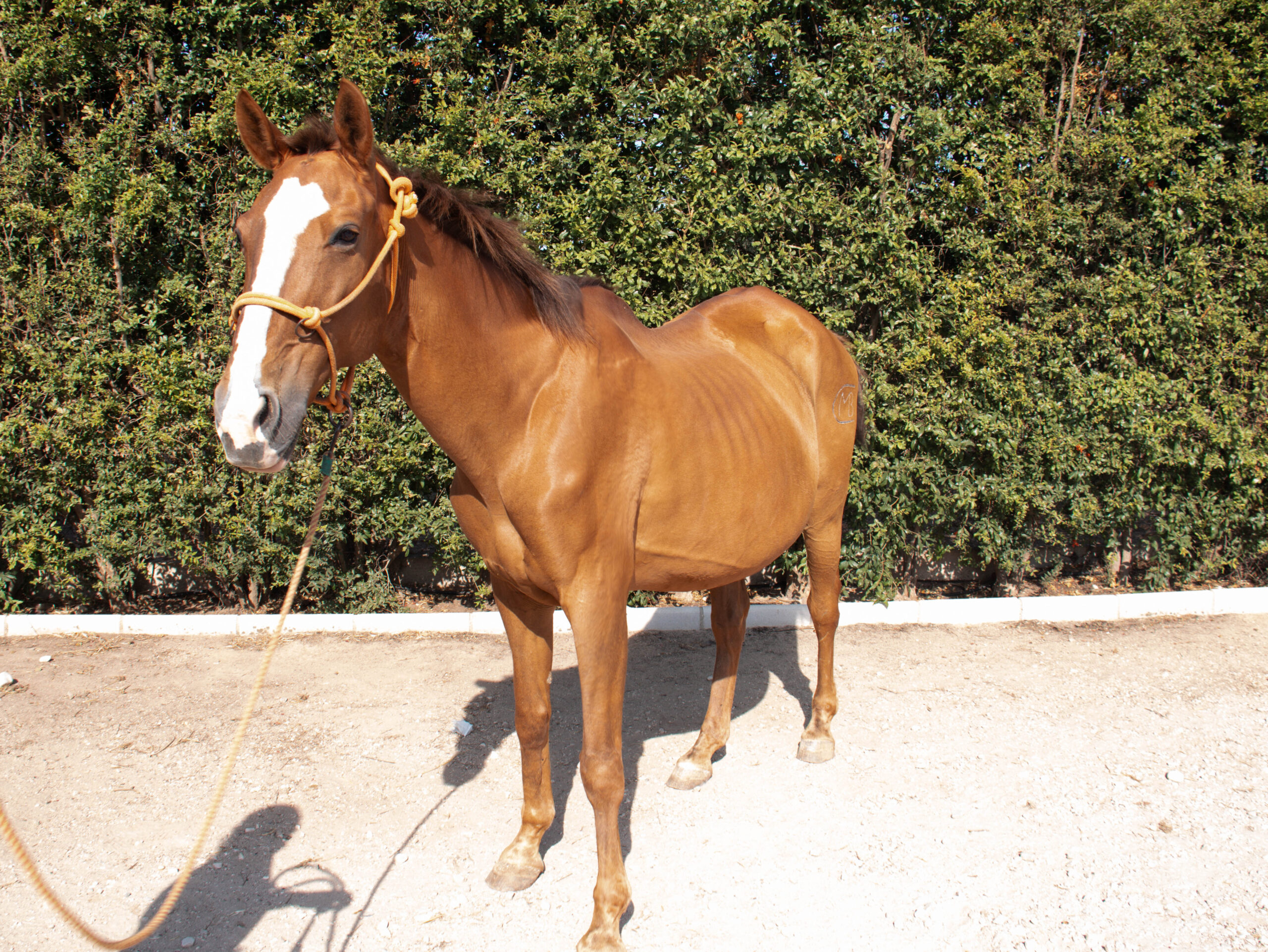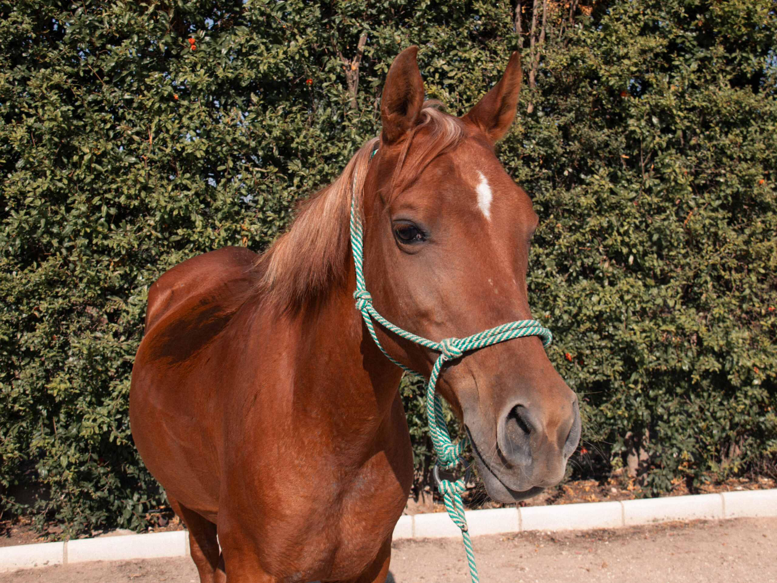 Sarada tiene X añitos lleva con nosotros desde X. Es una yegua alazana, es más bajita, ideal para los inicios en equitación de los más pequeños, pero sobre todo tiene la estatura perfecta para los terapeutas que ayudan a los usuarios desde abajo. Es muy cariñosa y transmite mucha confianza, por eso tanto los niños como los terapeutas adoran trabajar con ella. Sin embargo, lo que más le gusta a ella son las manzanas. ¡Le encantan!